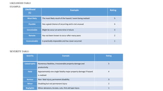 Likelihood L Example Rating Most likely The most likely result of the hazard event being realized 5 Possible Has a good chance of occurring and is not unusual 4 Conceivable Might be occur at some time in future 3 Remote Has not been known to occur after many years 2 Inconceivable Is practically impossible and has never.
